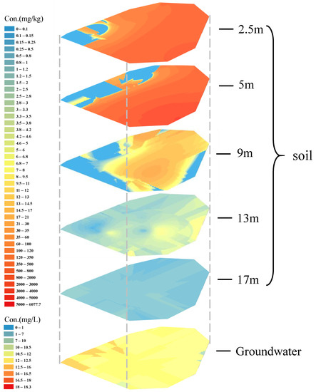 With depth changes, the spatial distribution of ∑PAHs in soil and groundwater varied significantly. As the depth increased, ∑PAHs concentration first increased (0 to 5 m) and then kept reducing (5 to 17 m). More profound than 5 m, the concentration gap of ∑PAHs in different regions was reduced gradually. However, the spread area expanded, and the distribution uniformized, meaning the pollutants in the vertical migration process continued to diffuse horizontally [35]. Until entering groundwater, the content gap of ∑PAHs in different locations reached the minimum; this is because the retardation ability of PAHs in groundwater is much weaker than that in soil, and the migration ability of PAHs is further enhanced, thus, easier to disperse with groundwater flow. Moreover, the distribution of PAH content at 17 m depth and groundwater indicated that PAHs migrated to the southwest direction, which may be caused by lithologic differences. With the same depth condition, the adsorption capacity of soil in the southwest direction may be weaker, so the migration degree of PAHs to the southwest direction is more severe during the infiltration process.