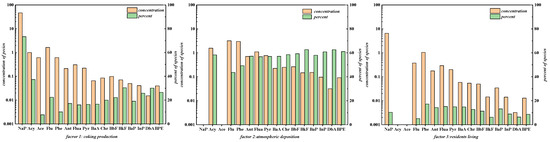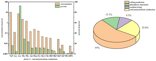 Factor 2 explains 13.1% of PAHs, which was inferred to be the source of atmospheric deposition because it is the primary source of Acy, Flu, Phe, Ant, Flua, Pyr, BaA, Chr, BbF, BaP, InP, DbA, and BPE, most of which are medium- and high-ring PAHs. The content and proportion of PAHs mentioned above were relatively uniform, which is the most significant feature of PAHs from atmospheric deposition [41,42]. In the study area, atmospheric particles emitted from the chimneys of coking and power plants settled on the surface, and the above-mentioned medium- and high-ring PAHs were enriched in these particles, infiltrating soil and groundwater [42,43,44].