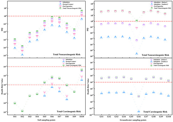 From the sampling points scale, the range of carcinogenic health risk of PAHs in the 10 soil sampling points was 1.38 × 10−9–4.68 × 10−5. SS10 had the highest risk, and SS2 had the lowest risk. The average carcinogenic risk values of SS5, SS6, SS7, and SS10 are more than 1 × 10−6, consistent with the point distribution of high content of the PAHs mentioned in Section 3.2.1, both located in the tar processing zone of the study area. The whole non-carcinogenic risk range of PAHs was 1.5 × 10−4–4.53; except for SS10, the rest of sampling points are below the USEPA limit (1). As for groundwater, the carcinogenic health risk range was 7.25 × 10−9–6.18 × 10−6; other than GS6, all sampling points of cancer health risks were higher than 1 × 10−6, with potential carcinogenic risk; the mean non-carcinogenic risk value was 1.21–63.4; all were much higher than 1, with a significant potential hazard.