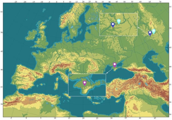 Crimea, the largest peninsula of the Black Sea, contains more than 50 saline and hypersaline lakes of continental and marine origin []. The extreme conditions of Crimean lakes are caused not only by high salinity, but also by unstable hydrology, high air and water temperatures (up to 35–40 °C in summer), and low oxygen concentration []. The investigated group of the South Ural hypersaline environments contains seven Sol-Iletsk lakes and a waterlogged area with a salinity gradient along the Tuzlukkol’ River. The Sol-Iletsk lakes have a karst-anthropogenic origin []. They belong to the national heritage of Russia and are recreation sources of Sol-Iletsk resort and are used for balneological and saline treatment. The lowland Tuzlukkol’ River is a small left-bank tributary of the Ural River. We investigated the waterlogged solonchak area within the natural boundary of the Tuzlukkol’ River. The solonchak has a geological origin and is associated with the occurrence of salts of the Kungurian stage of the Permian. There are numerous underground hypersaline springs of chloride–sulfate type, which merge with the main water flow and cause a salinity gradient within the natural boundary of the Tuzlukkol’ River. The waterlogged solonchak contains small lakes with therapeutic mud that are used for balneological and saline treatment. All studied saline and hypersaline water environments of the South Urals and Crimea have unstable hydrology and belong to a group of high mineralized water bodies of sodium–chloride type.