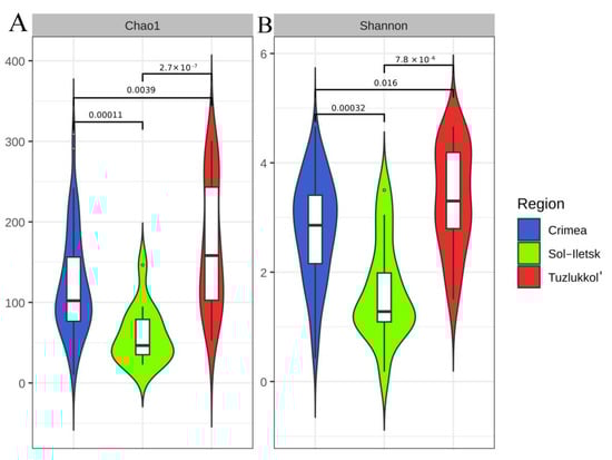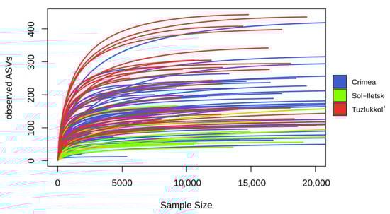 Based on the linear regression analysis (explanatory power: R2 = 0.3208, p-value = 3.072 × 10−11 for Chao1 and R2 = 0.2612, p-value = 3.753 × 10−9 for Shannon diversity), a decrease in the richness and diversity of protist communities with an increase in salinity has been shown. Protist communities in Sol-Iletsk and Tuzlukkol’ differed most strongly in terms of alpha-diversity metrics (Chao1 = 2.7 × 10−7; Shannon = 7.8 × 10−6). Sol-Iletsk and Crimean communities are characterized by moderate differences (Chao1 = 1.1 × 10−5; Shannon = 3.2 × 10−5), while the Tuzlukkol’ and Crimean communities were more similar (Chao1 = 3.9 × 10−4; Shannon = 1.86 × 10−3). The nonmetric multidimensional scaling (NMDS) analysis shows that eukaryotic community composition was ordinated along the salinity gradient with a gradual separation (Figure 11).