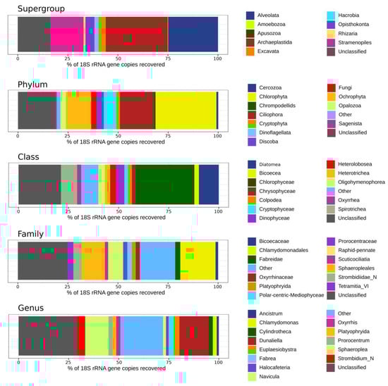 Protist community composition at different taxonomic levels. Only relative abundances greater than 1% are shown. Colors correspond to the taxa from each taxonomic level.