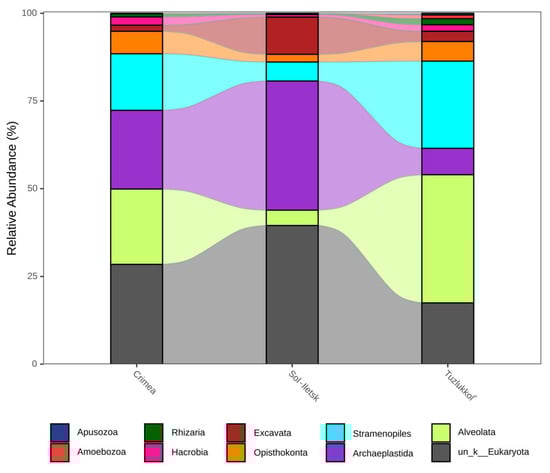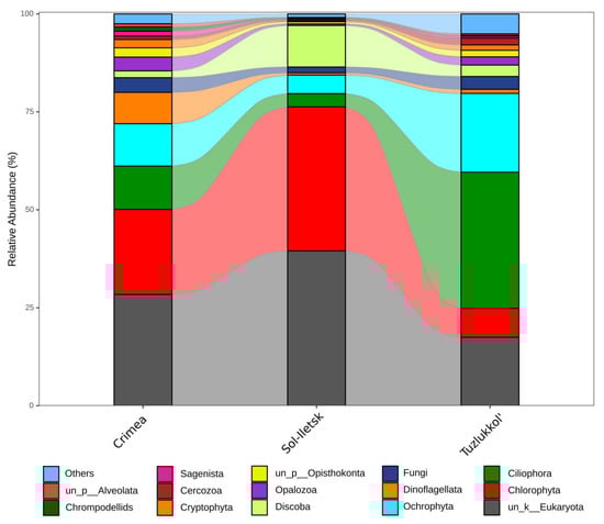 Unclassified eukaryotes were the most represented in Sol-Iletsk and Crimea samples, accounting for 39.5% and 28.4% of the total number of sequenced reads, respectively (Figure 4). At the same time, 17.5% of reads in the samples from Tuzlukkol’ could not be precisely assigned to any known eukaryotic taxonomic group (Figure 4).
