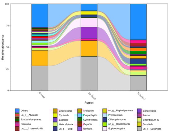 Archaeplastida was clearly the dominant group in the samples from Sol-Iletsk and Crimea, accounting for 36.8% and 22.5% in terms of relative abundance, respectively (Figure 4).