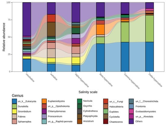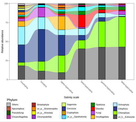 In general, Alveolata (44.5%) and Archaeplastida (22.6%) tend to increase in relative abundance in alpha-hypersaline waters compared to mixohaline and euhaline ones, while Stramenopiles (13.3%) show the opposite. The relative abundance of the Ciliophora and Chlorophyta increased compared to mixohaline and euhaline waters, while the abundance of dinoflagellates decreased. In addition, the number of unclassified eukaryotes decreased to 9.3% in alpha-hypersaline waters (Figure 8).