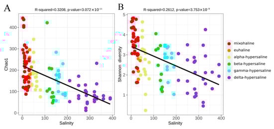 The alpha-diversity analyses (Figure 10) showed a strong negative correlation between diversity indexes and salinity (R = −0.64 for Chao1 and R = −0.6 for Shannon).