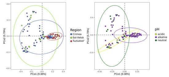 The PCoA analysis based on the Bray–Curtis similarity indices has revealed significant differences between communities (PERMANOVA, p < 0.05) depending on the geographical location and pH value (Figure 12). At the same time, the PCoA plot has not revealed clearly defined groups of samples by pH. The analysis of 18S rDNA sequences and the principal coordinates analysis of protist communities found a significant influence of geographic location in shaping the protist community composition (Figure 12).