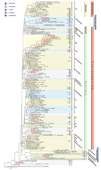 The majority of resulting sequences (33 ASVs) form diverse phylogenetic lineages and are placed within Pterocystida. The ASV3565 from 30‰ Crimean lake clustered in the Ch1 clade at an unresolved phylogenetic position. This clade contains a well-supported freshwater subclade uniting Ozanamia sp. (AY749605, LC682599), Ozanamia symna KF990487, Ozanamia curvata AY749616 and environmental sequences (DQ409130, DQ409105, DQ409132). The majority of revealed ASVs were attributed to the well-supported (81%) environmental NC6 clade, whose representatives demonstrate a considerable level of salinity tolerance from freshwater (AY821944, AY821943) to extremely hypersaline (250‰) habitats. The ASV6259 from mixohaline biotope (2‰) of the South Urals has an uncertain position inside Pterocystidae A. Interestingly, Pterocystidae A mainly contains sequences from freshwater biotopes, except ASV6259 and environmental sequence MH008568 from marine samples (31–33‰). The group of ASVs (4274, 5804, 4295, 7541, 4442, 5073) from the euhaline to gamma-hypersaline samples (10–160‰) and two environmental sequences (AY749520, JQ782283) of marine origin form a new clade of uncertain position within Pterista, albeit without support. The ASV4379 from the 2‰ sample of the South Urals was grouped with freshwater sequences of Pterocystis canadensis AY749633, Raineriophrys erinaceoides AY268043 and environmental sequences AY749497, AY749606 and AY749487 with low bootstrap support (68%) within Pterocystidae C. Besides this grouping, Pterocystidae C also includes a low-supported subclade (MH009909, MH009653, MH008558) of marine origin and two environmental freshwater sequences (AY749549, AY749610), though with negligible bootstrap support (51%). In general, Pterocystidae C can be characterized by moderate salinity tolerance (0–33‰). The ASV7981 from the 50‰ Crimean sample has an uncertain position within “Heterophryidae” without support. The H1 clade (bootstrap support 67%) is another group within Pterocystida with moderate salinity tolerance (0–33‰). Along with marine and freshwater environmental sequences, it contains ASV6566 from the sample with 2‰ salinity.