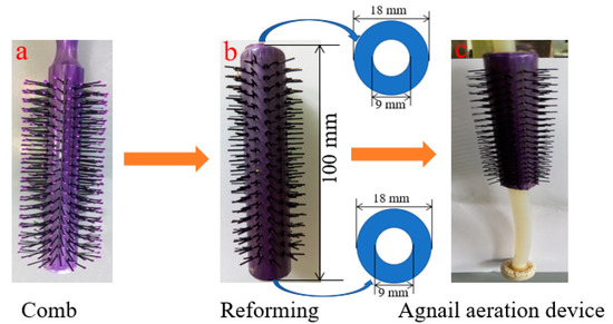 Combs made of plastic (Figure 1a) are usually used for one’s hair, and long hair falls during the dressing process. Then, it was remolded by manual work (Figure 1b), including the modification of both ends with two holes of 9 mm. Finally, the agnail device was successfully obtained (Figure 1c). This device easily traversed the air pipe (D = 8 mm) and was then put into the bioreactor (H × D = 100 cm × 10 cm) from the top in this work.