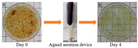 Figure 2 and Figure 3 show the results of the agnail aeration device (Figure 1c) for controlling large AGS and the organic removal rate. AGS with a large size (mean size = 3.5 mm, Figure 2a) became a small sludge (mean size = 1.5 mm, Figure 2b) in the SBR with the agnail aeration device on day 4. The AGS size distributions had outstanding changes; the proportion of AGS sizes of 4–5 mm, 3–4 mm, and 2–3 mm was 15 ± 0.5%, 25 ± 0.5%, and 55 ± 0.5%, which decreased to 2 ± 0.5%, 5 ± 0.5%, and 41 ± 0.5%, respectively (Figure 3a). However, the proportions of AGS size of 1–2 mm, 0.2–1 mm, and 2–3 mm increased from 10 ± 0.5% and 0% to 44 ± 0.5% and 8 ± 0.5% after a 4-day batch experiment (Figure 3b). The pollutants’ variations in COD and NH4+-N were also assessed; the influent COD was 566–599 mg/L, and the effluent COD increased from 0 to 53.2 mg/L (Figure 3c). However, the influent and effluent NH4+-N stayed at 25.9–27.1 mg/L and 0 mg/L (Figure 3d). These results indicate that the agnail aeration device can effectively control AGS size, and it had a slight influence on COD removal besides NH4+-N. This is consistent with previous work [27].