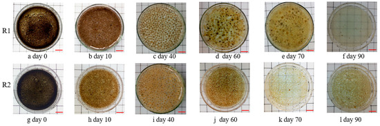 As shown in Figure 4, the dewatering sludge with a size below 1.5 mm was used as the seeding sludge in R1 and R2; the sludge presented a black-brown color and was regulated sharply (Figure 4a,g). After 10 days of running, an AGS with a brown color and elliptic sketch was rapidly formed and became predominant in both SBRs (Figure 4b,h). This suggested that the AGS was quickly cultivated by seeding the dewatering sludge, which agrees well with earlier studies [41,42]. Along with microbial growth, AGS with a large size was successfully obtained, and the extended filamentous bacteria were observed in the AGS system on day 40 (Figure 4c,i). After 15 days of operation, the filamentous bacteria of the large AGS grew on the sludge surface. This was due to the large AGS limiting the substance diffusion, which led the filamentous bacteria to extend to the AGS surface to live [16,17,23,24]. The agnail aeration device (Figure 1c) was employed in R2 on days 56–59, and this device was not used in R1 for the whole experiment. After that, the extended filamentous bacteria grew excessively and became the dominant in R1 on day 60 (Figure 4e); the large AGS began to break on day 70 (Figure 4e) and thoroughly disintegrated on day 90 (Figure 4f), which indicated that R1 failed in this experiment. However, the large AGS in R2 obviously became small granules on day 60 (Figure 4j), the extended filamentous bacteria did not grow excessively when enough nutriments were diffused into the sludge interior, the AGS slowly recovered from day 70 to day 90 (Figure 4h,l), and R2 was finally stable in the end. This indicated that the agnail aeration device restricted the AGS size and prevented the sludge from disintegrating from the filamentous overgrowth in this work.