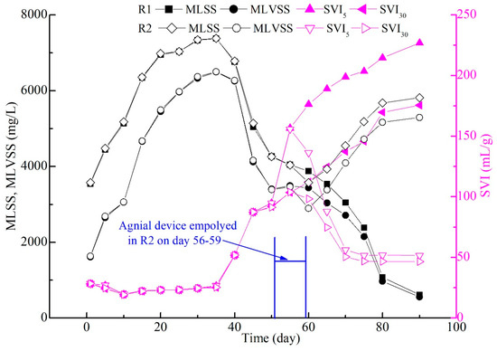 The initial MLSS and MLVSS of R1 and R2 were 3543–3573 mg/L and 1613–1633 mg/L, suggesting that the seeding sludge (dewatering sludge) contained about 55% inorganic matter. Then, these values in both SBRs showed an increasing trend, while SVI5 and SVI30 had no significant change before day 40 (Figure 5). In addition, the AGS in R1 and R2 were both clearly observed with a regulated sketch after 10 days of operation, and the extended filamentous bacteria appeared on the AGS surface on day 40 along with an increase in sludge size (Figure 4). Subsequently, some biomass began to be washed out from the bioreactors; MLSS and MLVSS decreased, while SVI increased. In R1, SVI5 and SVI30 quickly increased from 51.9–51.9 mL/g (day 40) to 226.8–175.5 mL/g (day 90) with excessive filamentous bacteria growth (Figure 4), indicating that the sludge’s settling ability became worse. As a result, the MLSS and MLVSS values in R1 both decreased from 6762–6251 mg/L (day 40) to 616–554 mg/L (day 90). The agnail aeration device was employed in R2 on days 56–59; the AGS size was effectively restricted, more small granules were presented on day 60 (Figure 4j), and the filamentous bacteria did not excessively proliferate as nutriments (C, N, P, DO) diffused into the small sludge interior. Meanwhile, SVI5 and SV30 values began to decrease from 155.8–103.9 mL/g (day 55) to 51.6–46.6 mL/g (day 90), and MLSS and MLVSS began to increase from 4036-3462 mg/L (day 55) to 5816–5293 mg/L (day 90) (Figure 5). This means that the gap between SVI5 and SVI30 was reduced in the extended filamentous bacterial AGS with a large size using the agnail aeration device in this work. These experimental results demonstrate that this agnail device could successfully restrict large AGS [27] and further prevent filamentous overgrowth for long-term operation in this work.