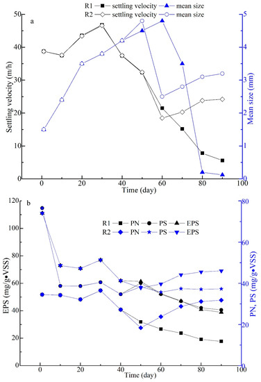 Changes of sludge characteristics on velocity & size (a), EPS (b) in the whole experiment.