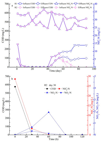 The performances of the COD and NH4+-N removal rates are shown in Figure 7a. Throughout the experiment, the influent COD and NH4+-N started at concentrations of 500–700 mg/L and 25–35 mg/L, respectively. After the seeding process, the effluent COD and NH4+-N both reached 0 mg/L on day 5, indicating that the biomass in the seeding sludge was quickly reactive in a suitable environment. In addition, the two values stayed at 0 on day 40, and then they both showed an increasing trend on day 45 when the extended filamentous bacteria grew excessively with the sludge size increasing in this work. Consequently, the AGS settling property deteriorated, and some sludge was washed out from the two SBRs on days 45–55 (Figure 4 and Figure 5). Because effective action occurred in R1, the filamentous bacteria quickly developed, and the AGS disintegrated (Figure 4d–f). Finally, the effluent COD and NH4+-N both showed an increasing trend, and the two values arrived at 109 and 13.9 mg/L on day 90 (Figure 7a). However, the effluent COD and NH4+-N both decreased on days 60–90 after the agnail device (Figure 1c) was employed in R2 on days 56–59. These results suggest that oversize AGS induces the filamentous bacteria to grow excessively and leads to sludge disintegration, which in turn negatively affects organic degradation [22,30]. This also proves that the agnail device effectively controlled the extended filamentous AGS size and maintained system performance in organic degradation in this work.