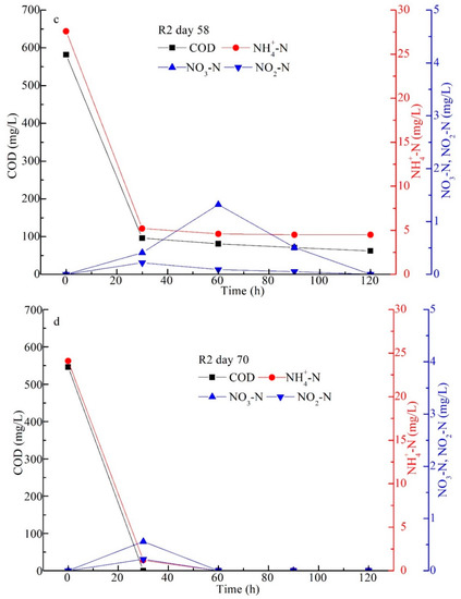Figure 7b–d show the variations in COD, NH4+-N, NO3−-N, and NO2−-N in R2 in one cycle on days 30, 58, and 70, respectively. The results suggested that COD and NH4+-N were almost entirely eliminated in 30–60 min of operation; then, NO3−-N and NO2−-N both increased from 0 to 1.93 mg/L (60 min) and 0.32 mg/L (30 min) and then decreased to 0 mg/L (90 min) on day 30, presumably due to AGS system running stably and R2 having a high amount of MLSS in R2 (Figure 5). This indicated that simultaneous nitrification and denitrification (SND) were achieved in R2 due to the large AGS with a mean size of 3.8 mm (Figure 6a). On day 58, SND was also obtained, but the effluent COD and NH4+-N were 60 and 4.5 mg/L (Figure 7c), which were higher than those on day 30 (Figure 7b). This was related to the coexistence of extended filamentous bacteria in R2 even though the agnail device (Figure 1c) was employed; then, some of the AGS was washed out at a relatively lower MLSS than that on day 30 (Figure 5). On day 70, the effluent COD and NH4+-N were almost entirely eliminated in 60 min of operation; then, NO3−-N and NO2−-N both increased from 0 to 0.56 mg/L (60 min) and 0.22 mg/L (30 min) and then decreased to 0 mg/L (60 min) (Figure 7d). This means that the SND process was also successfully obtained after AGS was oversized, and the extended filamentous bacteria were effectively controlled in this experiment. The experimental results demonstrate that the agnail device had no obvious effect on organic degradation through the SND process. This is agreed well with our batch experiment and a previous study [27].
