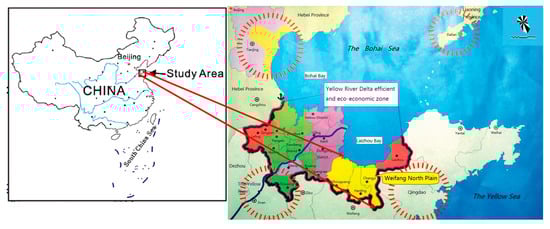 The study area is divided into Shouguang County, Changyi County, and Hanting District (Figure 1). It is located on the south bank of Laizhou Bay. The east is adjacent to Qingdao and Yantai City, and the west is adjacent to Zibo City and Dongying City. It is located between 36°41′~37°19′ north latitude and 118°32′~119°10′ longitude. It is classified as a warm temperate continental monsoon climate. The average annual precipitation is 560–660 mm, and the average yearly temperature is 12.3 °C. The total number of rivers is more than 100, each of which is a rain-fed river in the monsoon region, divided into a six-way groundwater aquifer system: Xiaoqing River, Mi River, Bailang River, Wei River, Jiaolai River, and Yu River. The average annual surface runoff volume is 17.0 × 109 m3. The study area is high in the south and low in the north, with an elevation between 2 and 7 m. The geomorphic types of the study area mainly include coastal plains, beaches, and shallow seas []. The coastal area of the study area is a typical silt shale coast in the north of China. It is mainly composed of silt, with an area of about 400 km2 and a total length of 140 km.