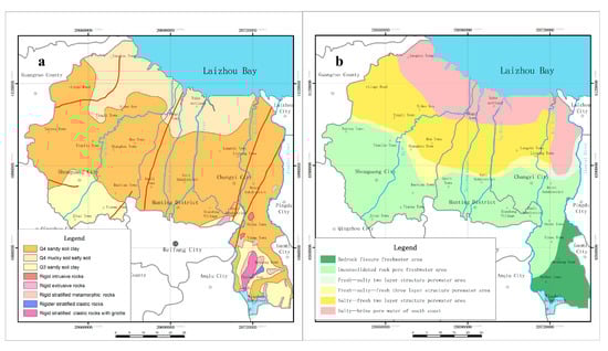 The study area belongs to the fault subsidence settlement area and deposits a set of Minghu town shale. During the Late Pleistocene and Holocene, a group of thick marine sands was deposited due to the influence of three sea transgressions. Most of the area is covered by Quaternary loose deposits with a maximum thickness reaching up to 400 m []. Since the Mesozoic, the tectonic movement in the study area has mainly been fault-block motion. The fault tectonic is relatively developed, including the northeast and north-northeast faults. The Yimu fault zone and its derived tectonic control, tectonic engender, development, magmatic activity, and mineralization of the study area were investigated (Figure 2a). According to the change in the hydrogeological characteristics in the horizontal and vertical directions, Gao et al. (2020), and Hu et al. (2020) [,] divided the soil area of Laizhou Bay into six water and geological zones: the bedrock fissures freshwater area, unconsolidated rock pore freshwater area, fresh–salty two-layer structure porewater area, fresh–salty–fresh three-layer structure porewater area, salty–fresh two-layer structure porewater area, and salty–brine pore water of the south coast (Figure 2b).