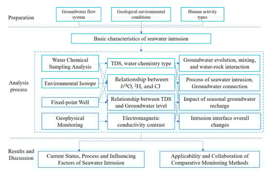 Based on the analysis of the results obtained from the above monitoring methods, the water chemical sampling analysis method and the geophysical monitoring method can be used in combination. After obtaining the approximate range and degree of regional seawater intrusion through the water chemical sampling analysis method, further use of geophysical monitoring methods can accurately delineate the boundary between saline and fresh groundwater, determine the burial depth of the top and bottom plates of aquifers containing saline or fresh water, and study the spatial evolution of underground saline and fresh groundwater bodies [,]. The advantage of the cross is that the seawater intrusion interface can be described quickly and accurately, and the degree of seawater intrusion can be determined. After understanding the groundwater flow system, the fixed-point well monitoring method can monitor the long-sequence dynamic characteristics of seawater intrusion at specific points, which can analyze the effect and the response of dynamic groundwater changes on seawater intrusion. This also helps confirm how seawater intrusion is determined by the water chemical sampling analysis method []. Combined with the geophysical monitoring method, it can verify the accuracy of the scoping of seawater intrusion. The combination of the environmental isotope method and the water chemical sampling analysis method can analyze and monitor the influencing factors of seawater intrusion. It can clarify the interconnectedness of different water bodies in the intrusion process [].
