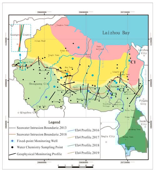 - Jinjie, M. Dynamic Monitoring and Evolution Study of Saline Intrusion at South Coast of Laizhou Bay; China University of Geosciences: Beijing, China, 2014. [Google Scholar]