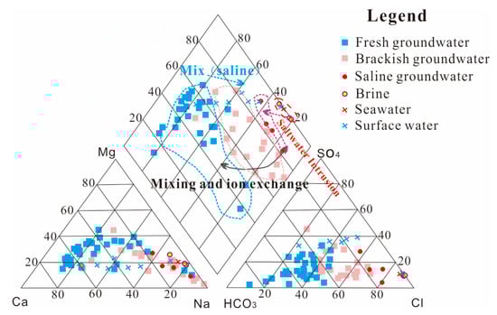 The variation characteristics of groundwater chemical composition along the process show that it is controlled by mixing and water–rock interactions. Affected by leaching and cationic alternating adsorption [,], the chemical type of fresh groundwater changes from Ca·Mg-HCO3 to Na-HCO3·Cl, Na·Ca-HCO3·Cl from south to north, and the changing trend of brackish groundwater is from Mg·Na·Ca-HCO3, Mg·Ca-HCO3 to Na-Cl·HCO3, Na·Mg-Cl. Saline groundwater is mainly of the Na-Cl and Na·Mg-Cl type. Brine is of the Cl-Na type. The distribution characteristics of various ion contents in shallow groundwater show noticeable differences among geomorphic units and exhibit certain regularity. Along the sampling profile of groundwater from south to north, the concentration of various ions in groundwater fluctuates. Among them, the ion HCO3 concentration shows a trend of slow increase followed by a slight decrease. In mountainous and alluvial plains, the concentrations of various ions in groundwater are relatively low and deliver a slow-increasing trend, while they increase sharply in estuarine plains. The distribution of different groundwater bodies along the route shows a wide band-like distribution. There is no SO4-type water in many groundwater chemical types, indicating that the mixing effect of groundwater with different salinity is strong. Furthermore, in some relatively low-lying areas in the shallow groundwater at the foot of the mountain, there is a relatively high Cl-content phenomenon, indicating that this area is significantly affected by evaporation and concentration.