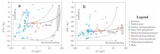 The values of shallow fresh groundwater range from −11.3‰ to −4.2‰ for δ18O and from −73.6‰ to −46‰ for 2H; the values of deep fresh groundwater range from −11.3‰ to −4.2‰ for δ18O and from −75.4‰ to −58.9‰ for 2H; the values of shallow brackish groundwater range from −14.9‰ to −6.3‰ for δ18O and from −66.3‰ to −46.5‰ for 2H; the values of deep brackish groundwater range from −15.5‰ to −9.6‰ for δ18O and from −71.3‰ to −60.8‰ for 2H; the values of saline groundwater range from −14.4‰ to −6.6‰ for δ18O and from −64.6‰ to −52.6‰ for 2H; the values of surface water range from −5.6‰ to −1.2‰ for δ18O and from −49.7‰ to −19.6‰ for 2H. The relationship between δ18O, 2H, and Cl− shows that the groundwater was affected by various evaporation, dissolution, and mixing in the runoff process. Fresh groundwater was affected by evaporation, resulting in a noticeable change of δ2H and δ18O; brackish groundwater and saline groundwater were significantly affected by dissolution and mixing; brine was affected by evaporation-concentration and mixing []. As described above, deep groundwater to brine water conformed to a gradual mixing pattern from south to north. In contrast, the mixing pattern of shallow groundwater to brine water was more complex, reflecting that atmospheric precipitation, surface water, and irrigation water influence the recharge sources for shallow groundwater. From the endpoint-element mixing model analysis, fresh groundwater, brackish groundwater, and saline groundwater samples were relatively evenly distributed on the mixing trend line of shallow fresh groundwater–seawater and shallow fresh groundwater-brine, indicating that the shallow freshwater was affected by both brine and seawater intrusion [,]. On the trend line of mixing deep fresh groundwater–seawater and deep fresh groundwater–brine, there were sample points of fresh groundwater, brackish groundwater, and saline water. However, the sample points of brackish groundwater were mainly concentrated near the mixing line between fresh water and seawater, indicating that deep groundwater tends to mix more with seawater first and is more affected by seawater intrusion []. The deep saline and shallow saline groundwater samples showed a relatively obvious approach, indicating that in some areas, the hydraulic relationship between them is caused by string mining, etc. [].