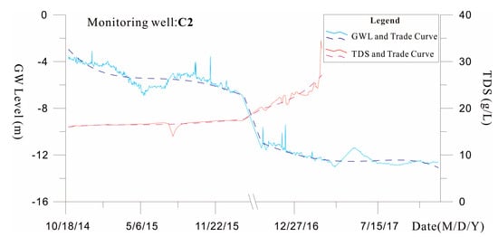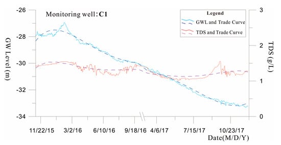 The monitoring well’s TDS and water level data were analyzed and mapped using the software Grapher 10. The monitoring well C1 was located in the brackish groundwater area. The monitoring data show that the dynamic type of groundwater was runoff extraction (Figure 7).