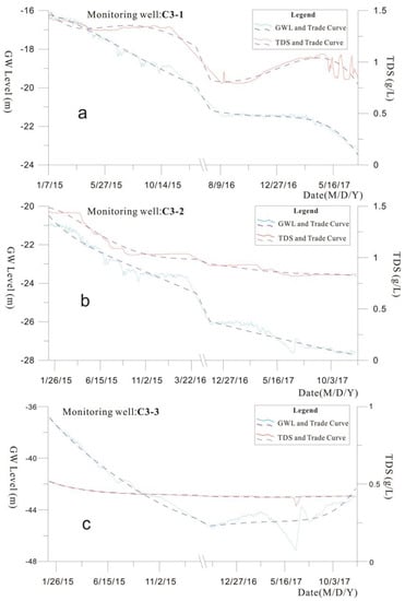 Diagram of correlation between groundwater level and TDS variation in wells C3-1 (a), C3-2 (b), and C3-3 (c).