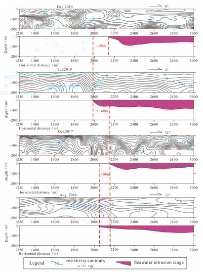 We interpolated the resistivity in the software Sufer 12 and obtained a contour profiles map of resistivity values. From the comparison of monitoring profiles (Figure 10), the resistivity contour of the shape is stable and continuous. The resistivity shows a trend of high in the south and low in the north, consistent with the distribution characteristics of saline groundwater and fresh groundwater in the striatum [,,]. According to previous experience and the results of comparative field experiments [,,,,], it was determined that the seawater intrusion interface was delineated with a resistivity value of 8–10 Ω·m. The monitoring data show that in August 2019, the seawater intrusion front was located near the 2050 m, determined by the resistivity anomaly interpretation. In October 2017, the seawater intrusion front retreated northward by about 100 m to the vicinity of the 2150 m, with a rate of approximately 85.7 m/a. From July 2018 to December 2019, the seawater intrusion front first showed the characteristics of intrusion to the south and then retreated to the north. Considering the effect of the profile offset angle, the south intrusion and north retreat rates were approximately 213.3 m/a and 105.9 m/a, respectively. From the long-term monitoring data, from August 2016 to December 2019, the seawater intrusion front on the Dawangdong profile retreated northward at approximately 27 m/a.