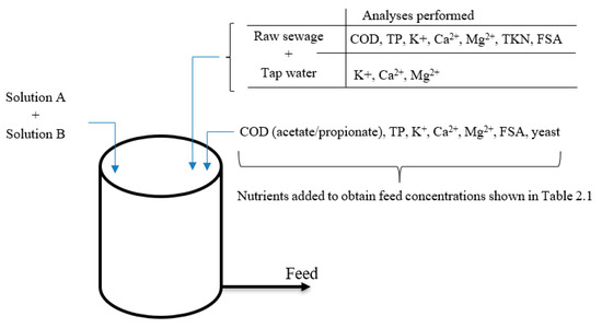 Measurements were conducted and data collected from (1) the influent to the AS system, made up of settled sewage, VFAs, i.e., acetate or propionate and tap water from dilution and (2) at the sampling points of the experimental AS system as shown in Figure 1. The settled sewage collected from a nearby WWTP in Cape Town, South Africa, was analyzed for COD, TP, K+, Ca2+, Mg2+, TKN and FSA concentrations. Tap water, also used to make up a feed, was analyzed for three minerals: K+, Ca2+ and Mg2+ concentrations only. These tests were performed to figure out how much extra nutrients needed to be added to the feed to make sure that PAOs were getting all the nutrients they require. Calcium chloride dihydrate was used for Ca2+, dipotassium hydrogen phosphate was used to supplement P and magnesium chloride hexahydrate was used for Mg2+. A schematic representation of the feed preparation process is shown in Figure 2. How well the UCTMBR system was working was checked by doing tests in sampling points marked in Figure 1.