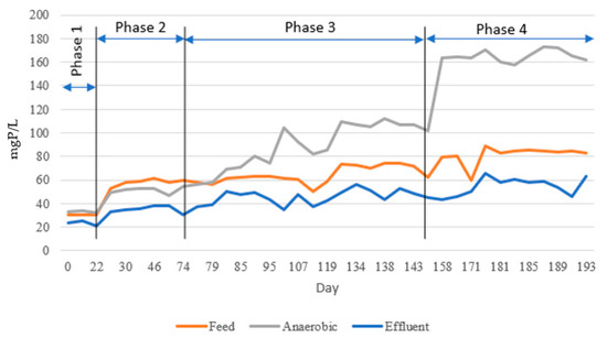 Orthophosphate (OP) concentration in the feed tank, anerobic cell and effluent.