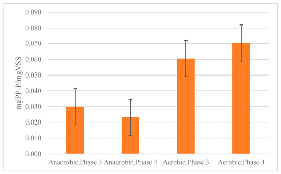 Figure 5 shows how much PP was in the AS biomass in the aerobic and anerobic cells during Phase 3 and Phase 4. As discussed above, there was no PAO activity at the beginning, so the Start-up phase is not shown in Figure 5. In Phase 3, the concentration of PP in the anerobic cell was less than half of the concentration in the aerobic cell, as seen in Figure 5. Again, in Phase 4, the concentration of PP in the anerobic cell was less than that of the aerobic cell and the difference was bigger during this phase. It was 0.023 ± 0.008 mgPP/mgVSS in the anerobic cell and 0.07 ± 0.003 mgPP/mgVSS in the aerobic cell. These observations have shown that PP is utilized as propionate is sequestered by PAOs and replenished as P is taken up. This concurs with findings from numerous studies [7,36,37]. Moreover, in Phase 4, the concentration of organic P of 0.0901 ± 0.003 mgP/mgVSS in the biomass is greater than 0.02 mgP/mgVSS in fully aerated AS system biomass. The increase in stored PP concentration in the aerobic cell provided additional proof that the population of PAOs is directly proportional to the VFA influent concentration. As shown in Figure 5, PP went up during Phase 4 compared to Phase 3.