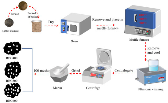 Rabbit manure from a rabbit breeding base in Chengdu City was selected as the raw material for biochar. Large impurities, including grass and leaves, were removed from the manure using a mesh sieve and tweezers. The manure was then broken up using a crusher. The crushed rabbit excrement was dried in an oven at 105 °C for 24 h. An appropriate amount of the material was collected for weighing, placed in a crucible, compacted, and covered with a tin foil-wrapped crucible in a muffle furnace. The material was heated in the muffle furnace at a speed of 10 °C/min at set temperatures (400 °C, 500 °C, and 600 °C). After constant-temperature heating for 2 h, the material was taken out and cooled to room temperature. After the cooling pyrolysis products were mixed with 1 mol/L HCl at a 1:25 (m/V, g/mL) solid–liquid ratio, ultrasonic cleaning was performed for 10 min, the supernatant was skimmed off, and the same volume of HCl was added. The process was repeated thrice. Finally, the pyrolysis products obtained after HCl cleaning were centrifuged and repeatedly rinsed with deionized water until the clear liquid was neutral. The collected solids were dried at 105 °C to a constant weight, then ground with a mortar and screened with 100 mesh (0.15 mm) to obtain RBC400, RBC500, and RBC600. The prepared rabbit manure biochar was sealed in a ziplock bag, marked, and kept in a brown vacuum dryer. Figure 1 depicts the precise preparation procedure.