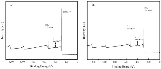 The surface element compositions of RBC400, RBC500, and RBC600 were characterized and analyzed using X-ray photoelectron spectroscopy (XPS) spectra. The test target was a copper target with a scanning range of 10–80° and a step size of 2°/min. Figure 5 depicts the XPS spectra of the three materials, and Table 2 shows the elemental composition of the materials. The XPS also showed that three main characteristic peaks were detected on the three biochar samples, corresponding to O 1 s (532.08 eV), C 1 s (400.08 eV), and N 1 s (248.08 eV), respectively. The elemental composition analysis showed that the main element components of the three biochar surfaces were O, C, and N. As shown in Table 2, with the increase in the pyrolysis temperature of rabbit biochar, the C content on the surface of the generated biochar also increased to a certain extent, which indicates that the increase in the pyrolysis temperature can improve the carbonization degree of rabbit coprobiochar to a certain extent, which matched the FT-IR characterization findings.
