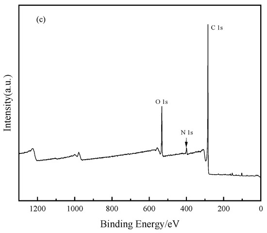 XPS diagrams of different biochar: (a) RBC400, (b) RBC500, and (c) RBC600.