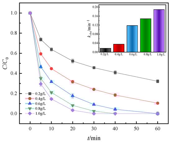 Biochar dosage is an essential factor affecting the process of biochar-activated PMS in degrading pollutants. It determines the cost input required by the system to degrade pollutants to a certain extent. Therefore, it is crucial to select the most appropriate biochar dosage. The experimental results of the influence of biochar dosage are shown in Figure 9.