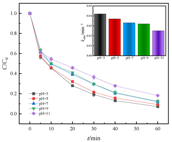 The initial pH of the solution is also an important factor affecting the degradation of pollutants in the persulfate system. Within the range of pH set in the experiment, the degradation efficiency of RhB in the system varied (Figure 11).
