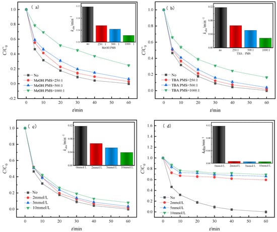 MeOH and TBA are usually used to assess the production of SO4·− and ·OH in a reaction system. MeOH can effectively quench the two free radicals (SO4·− and ·OH) with different reaction rates (kSO4·− = 1.1 × 107 M−1s−1, k·OH = 9.7 × 108 M−1s−1). The reaction rate of TBA with ·OH was 6 × 108 M−1s−1, but that with SO4·− was significantly lower (4 × 105 M−1s−1); thus, TBA can be used as a quencher of ·OH [44]. Figure 14a,b shows the experimental results of the quenching agent and PMS at different molar ratios, respectively. When the molar ratio of MeOH and PMS increased from 0 to 1000:1, the degradation rate of RhB decreased from 99.97% to 75.35%, denoting a decrease of 24.61%. kobs decreased from 0.118 min−1 to 0.022 min−1 (81.36%). When the molar ratio of TBA to PMS increased from 0 to 1000:1, the degradation rates of RhB were 99.97%, 98.47%, 96.19%, and 83.75%, and kobs decreased from 0.118 min−1 to 0.065, 0.051, and 0.028 min−1, respectively. These results indicated that both types of free radicals could inhibit the degradation of RhB, and the degree of inhibition of the reaction increased with the increase in the concentration of the quenching agent. Free-radical quenching experiments showed that both SO4− and ·OH participated in the degradation of RhB, but ·OH performed a more important role than SO4·−.