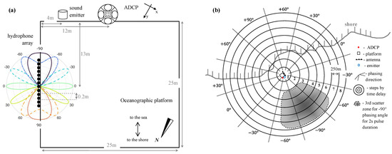 Scheme of the experiment in the horizontal plane: (a) the platform with sensors and antenna directional pattern; (b) map with the platform in the center.