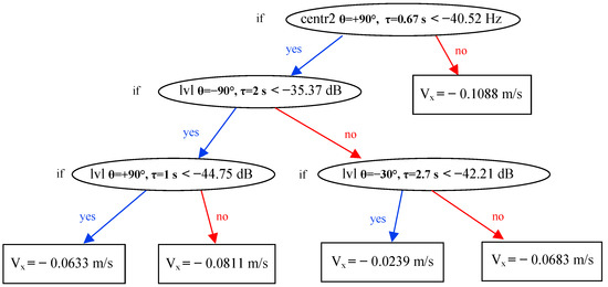 Flow parameter estimation can be considered by developing a function () that maps an input signal () to a flow vector (). Because the codomain of f is , we build f as a tuple () of functions and independently. According to , we denote the east projection of the water flow vector, and according to , we denote the north projection. In this work, we construct functions as a composition and as , where is a function that maps an input signal vector () to a feature vector (). and are the functions that are constructed by a machine learning algorithm at the training stage. In the present work, we used the extreme gradient boosting algorithm as the machine learning algorithm [21]. The XGBoost algorithm operates through an iterative process, constructing a sequence of decision tree models, each of which focuses on the residual errors of the previous model to successively refine its predictions. The description of the algorithm is too extended to include here. An example of a decision tree is plotted in Figure 4. The decision tree outputs (i.e., leaf values) are summed up to obtain and .