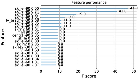 Top 20 feature importance for a 2020 Hz carrier frequency. ”F score” value indicates how many times the feature was used to split the data across all trees. In total, the model comprises 200 trees.