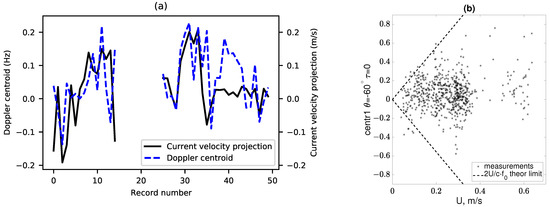 We relate the value of to the feature denoted as “centr1” or the Doppler centroid. In the primary analysis, a direct comparison between and U was made. To ensure the most accurate comparison with the U and values measured by ADCP, we selected the smallest possible signal-gating delay to calculate . In Figure 7a, one of the flow components and the Doppler centroid (along the least noisy direction) are plotted on the same axes. For this figure, the two most successful time intervals were used. Specifically, for the Figure 7a, we used the results of the processing performed in [16,20], which differ in a coarser time scale from those reported in the rest of the paper. The Doppler shift was calculated from the antenna directional channel (), where two beams in the horizontal plane take place. The angles between the beams and the inverted selected flow component are and . Due to difficulties in determining the angle between the beam and the flow (caused by the ambiguity), the diagram shows the same type of Doppler function of the centroid depending only on the modulus of the flow current (see Figure 7b).