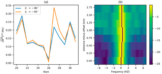 The value of was used to sort the data, namely to identify samples that were worth paying special attention to, e.g., a large value was found on 21 September 2021 (see Figure 8a). A set of normalized Doppler spectra for a half-hour interval within that day was plotted against the distance in Figure 8b. The aim of that figure was to show that a different spectral shape can be observed in the echo signal coming from different points.