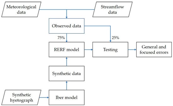 Considering the exposed approaches and the usual evaluation metrics of the models, few works in the recent literature have used both physically based and ML models together, especially aimed at enhancing the accuracy of high streamflow predictions [26,29] and only a minor part of the studies has considered the imbalanced domain of the streamflow records (from the flood analysis perspective) and different ranges to evaluate the predictions of the models [39,44,45]. To tackle this gap, this study proposes a methodology to combine physically based and ML models that is fully focused on improving the performance for streamflow prediction on high values. In order to reach that goal, the aim of the present work is to combine measured and synthetic data generated by a physically based model to enhance the capabilities of an ML model on the prediction of high discharge. Furthermore, the ML model produced with the combination of data is contrasted with an ML model purely trained with observed data where precision, under- or overestimation, and utility are evaluated on the most relevant values. In this sense, the imbalanced domain of the data is also taken into account. The Regression-Enhanced Random Forest (RERF) algorithm [24] was used in this study, an algorithm focused on improving the extrapolation capacity of the Random Forest (RF) model. This approach may help deliver more accurate information about risk cases to emergency services, which is crucial in EWS [9].