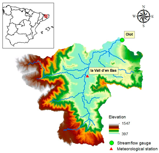 The study area is the upper Fluvià river catchment, with the outlet point in Olot. The catchment is located in the autonomous community of Catalonia, Spain (Figure 2). It has an area of 133.68 km2, the mainstream length is approximately 22.60 km, the elevation ranging from 1547 to 397 masl, and the mean slope of the catchment is 34%. The concentration time computed by Témez [46] method is 3.9 h. The annual mean precipitation is 910 mm and the temperature varies from almost 40 °C in summer to −8 °C in winter. Within the catchment, there is only one meteorological station called la Vall d’en Bas operated by the Meteorological Service of Catalonia (Meteocat) and the streamflow gauge is located in the small town of Olot, in the outlet of the catchment, operated by the Catalan Water Agency (ACA).