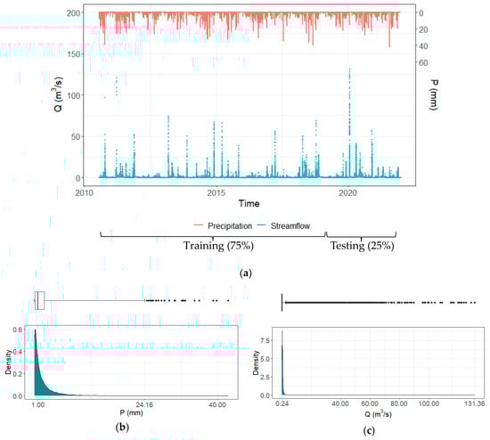 (a) Time series plot of streamflow and precipitation; (b) density and boxplot for precipitation p > 0.1 (mm); (c) density and boxplot of streamflow.