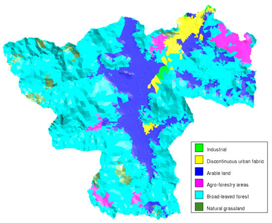 Consequently, the parameter considered in the calibration process was the curve number (CN). CN was computed as a weighted value regarding a simplified land use map based on CORINE data [48] and six land uses were adopted (Figure 4). The soil group selected was B, according to what was explained in Section 2.2. Considering this configuration, CN varies from 39 to 78 for dry to wet conditions, respectively. In the calibration process, CN = 45 was selected. Manning’s numbers for the different land use were left as default values given by the Iber model, which are taken from [67]. The wet-dry limit was set in 0.0001 (m) and the numerical scheme used was the decoupled hydrological discretization (DHD) [63].