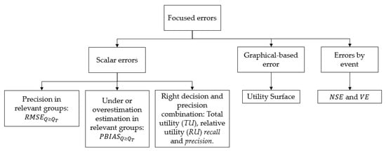 where n is the total number of data, and are the predicted and observed streamflow, respectively, and are the mean values of predicted and observed streamflow, respectively. MAE, RMSE and MAPE are precision metrics of the model and they vary from 0 to ∞, where values close to 0 indicate high precision of the predictions. is a dispersion measurement, which varies from 0 to 1, indicating the lowest and the highest correlation between observed and predicted values, respectively [79]. The focused errors of this study are divided into scalar, graphical-based errors [80] and errors by event. In Figure 5, a summary of these and their structure is shown, while the different errors are described in subsequent sections.