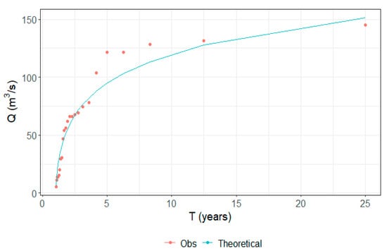 In order to find the streamflow values for a certain return period, we took into consideration 24 yearly maximum streamflow values that were at our disposal (from 1996 to 2008 and from 2011 to 2021). Years with most of the data complete were considered. These data were adjusted to a generalized extreme value distribution type I (GEV I) (Figure 6), which has been widely employed for frequency analysis in the field of hydrology [66,83]. However, to test whether the distribution generates an acceptable adjustment, the Kolmogorov-Smirnov test was applied. It resulted in an acceptable adjustment for a 0.05 significance level (). Based on the theoretical distribution, , , and .