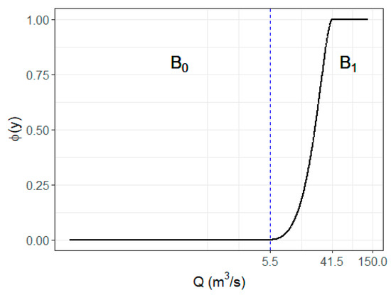 The relevance function ( [0, 1] was built using the Piecewise Cubic Hermite Interpolating Polynomials function (pchip), as it was suggested by Ribeiro [85], using the library pracma of R programming language [86]. The subgroups (also called bumps) and represent two different actions, not to issue an alarm and issue it, respectively. Values below 5.5 (m3/s) () do not have relevance because they are so small that there is no need to issue an alarm by flooding. From 5.5 (m3/s) onwards (), the relevance starts to grow until it reaches the maximum value at 41.5 (m3/s), and from there, the relevance is the highest for every value. If the observed and predicted values do not have relevance, there is no utility.
