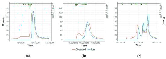 Three events of the training set were used to calibrate the Iber model for the catchment (Figure 8). They were selected because they are among the highest events in the training set. Figure 8a shows the highest events in the training set and the Iber model results. The peak discharge is 121 (m3/s) and the timeframe considered was from 14 March 2011 to 16 March 2011. Figure 8b,c shows two of the highest events of the training set with peak discharges of 74.3 and 67.7 (m3/s), respectively. The timeframes considered for these events are from 4 March 2013 to 7 March 2013 and from 27 November 2014 to 2 December 2014, respectively. NSE reached was either good or satisfactory according to the bibliography [90,91], with values of 0.64 (Figure 8a), 0.67, and 0.37 (Figure 8b,c) for the three events, respectively.